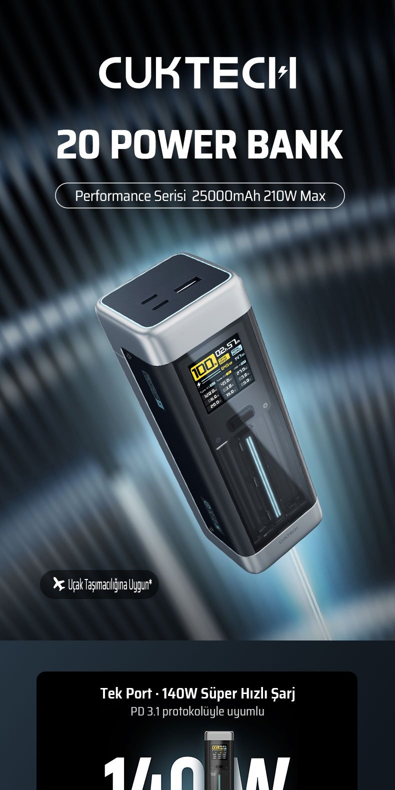 CUKTECH 20 Powerbank 25000 mAh – 210W PD 3.1 Hızlı Şarj | TFT Ekranlı | 3 Port (2×USB-C + 1×USB-A)