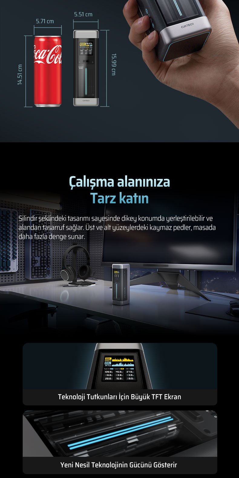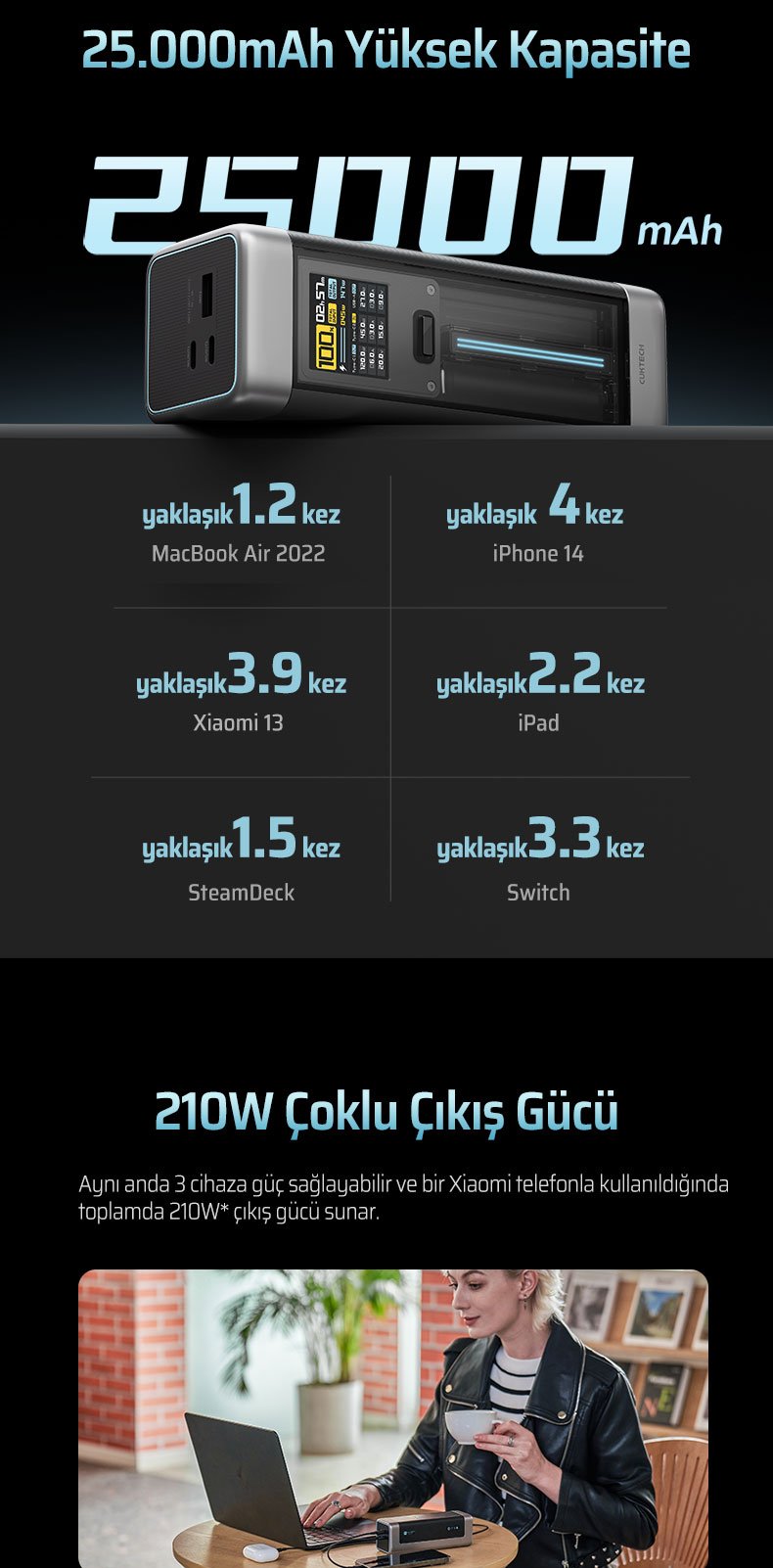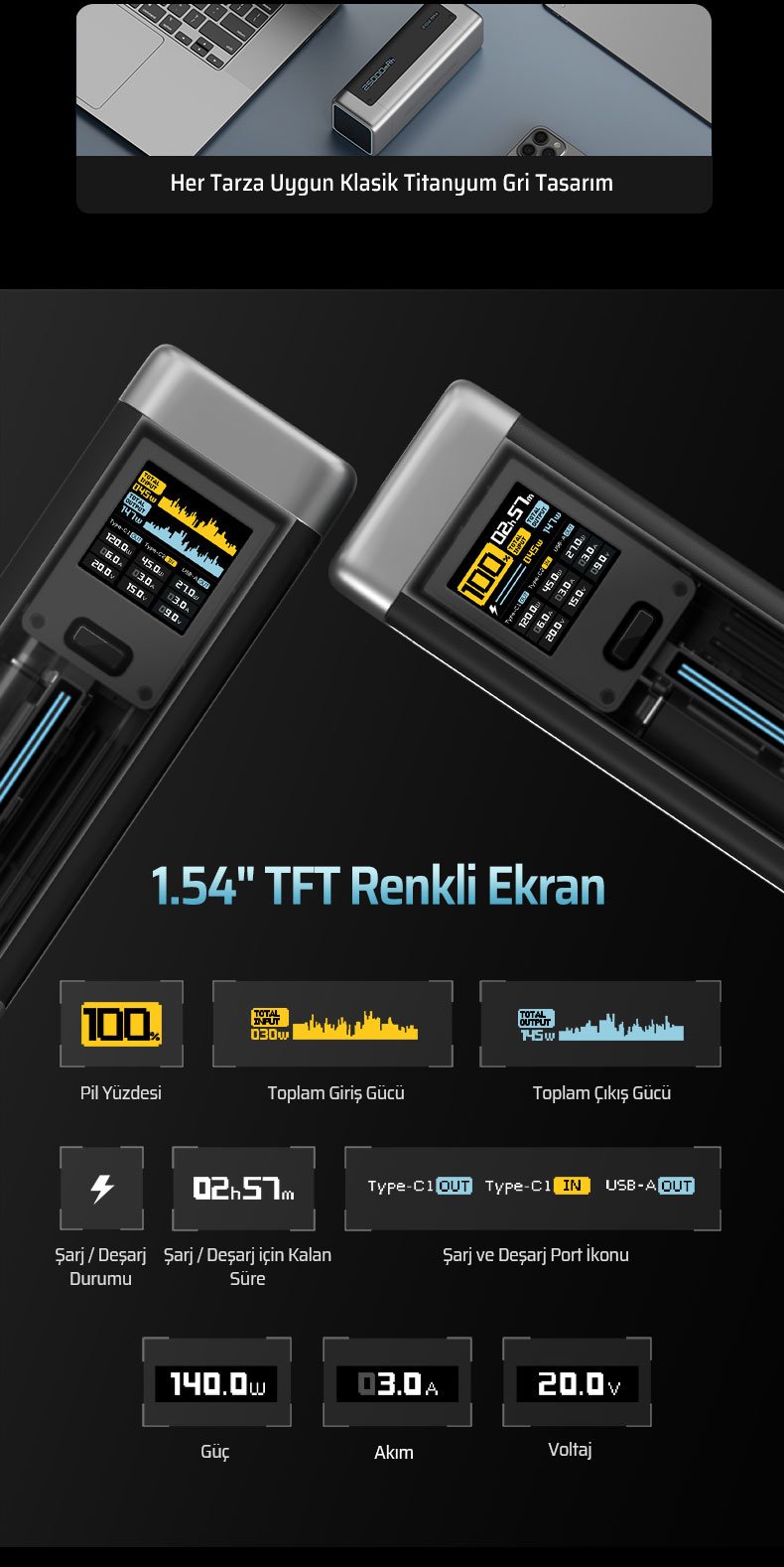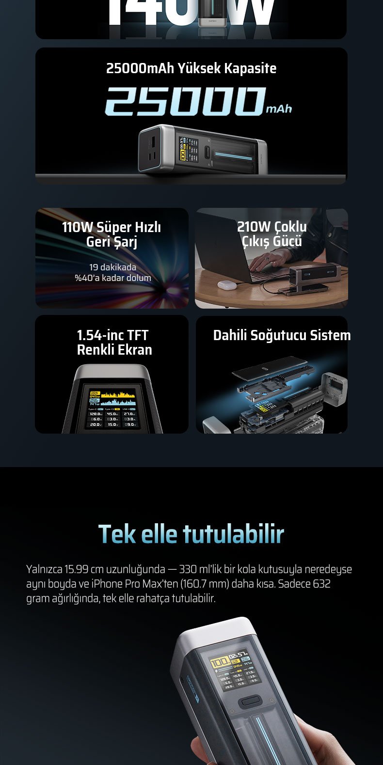 Yüksek kapasiteli 25.000 mAh bataryası, güçlü hızlı şarj teknolojisi ve akıllı TFT ekranı sayesinde laptop, telefon ve tablet gibi birçok cihazı yüksek hızda ve güvenli şekilde şarj eder.