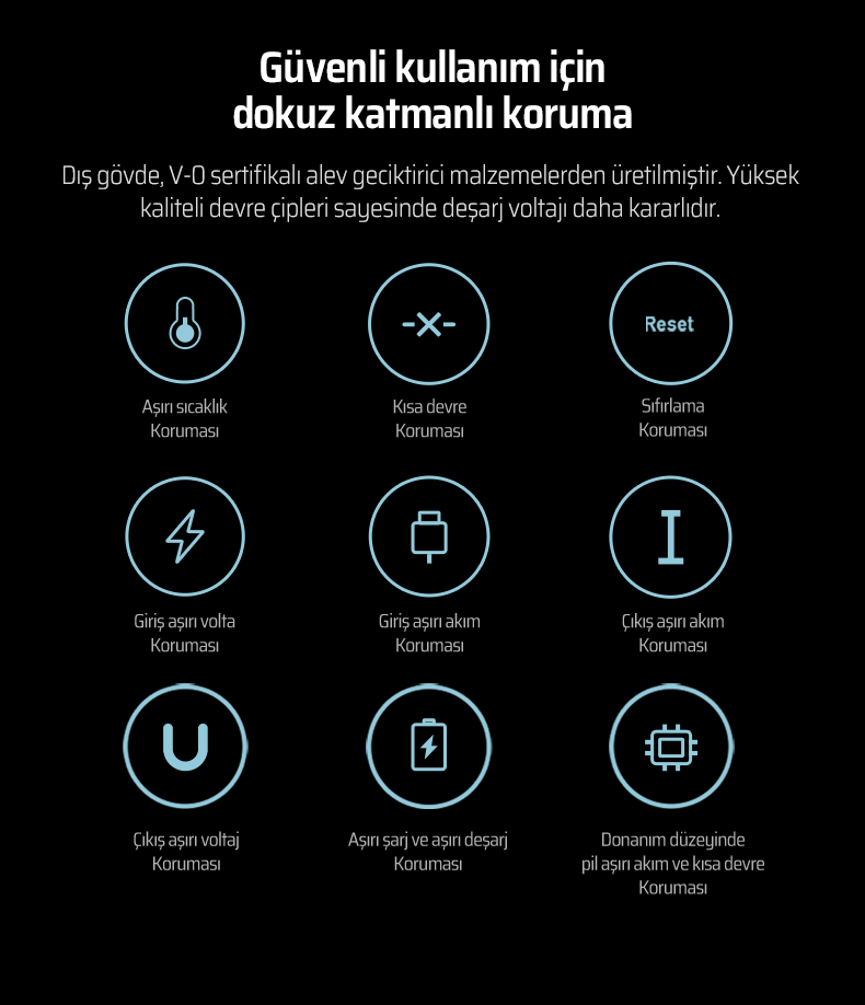 Gelişmiş güvenlik sistemi sayesinde cihazlarınızı güvenle şarj edebilirsiniz.